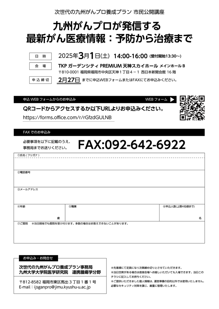 市民公開講座「九州がんプロが発信する 最新がん医療情報 -予防から治療まで-」(3月1日)
