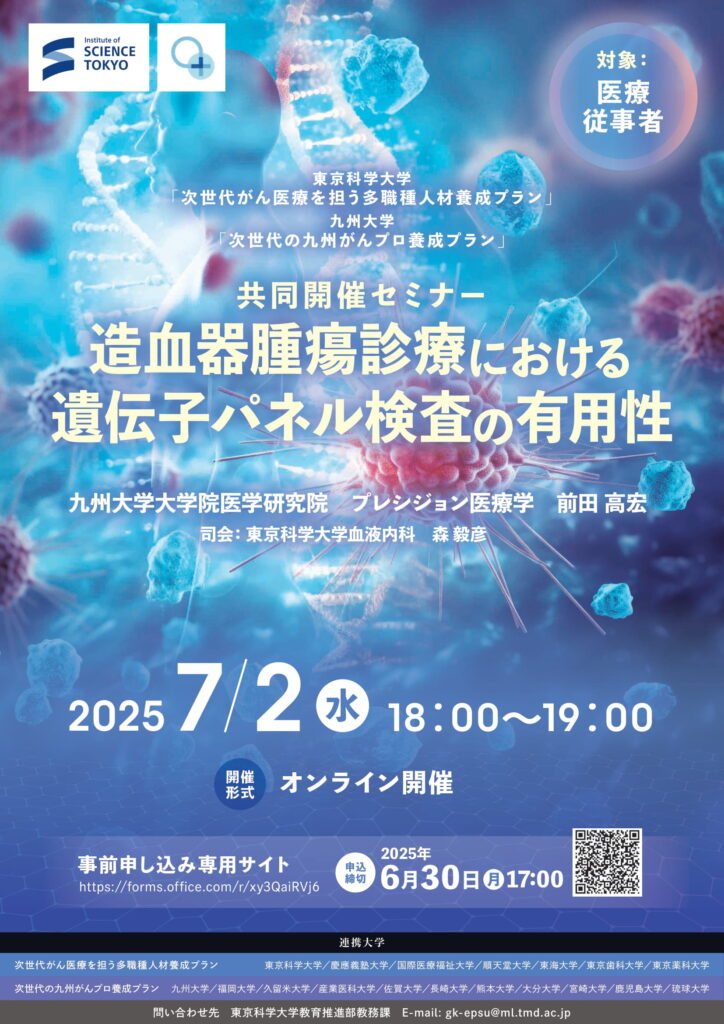 〇プログラム: 講演 「造血器腫瘍診療における遺伝子パネル検査の有用性」 演者: 前田 高宏 (九州大学大学院医学研究院 プレシジョン医療学 教授)